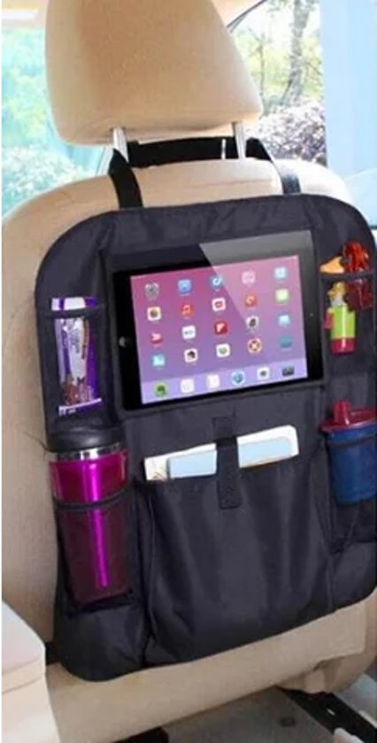 Deze superhandige auto-organizer is een onmisbare accessoire voor in iedere auto! De vier netvakken met elastische band en een voorvak met klittenband zorgen voor genoeg ruimte om waterflessen, boeken, speelgoed en snacks in op te bergen. Daarnaast is er ook nog ruimte voor je iPad of tablet. De speciale touchpad ondersteuning zorgt ervoor dat de iPad of tablet gewoon gebruikt kan worden. Ideaal om onderweg filmpjes te kunnen kijken of om spelletjes te spelen.